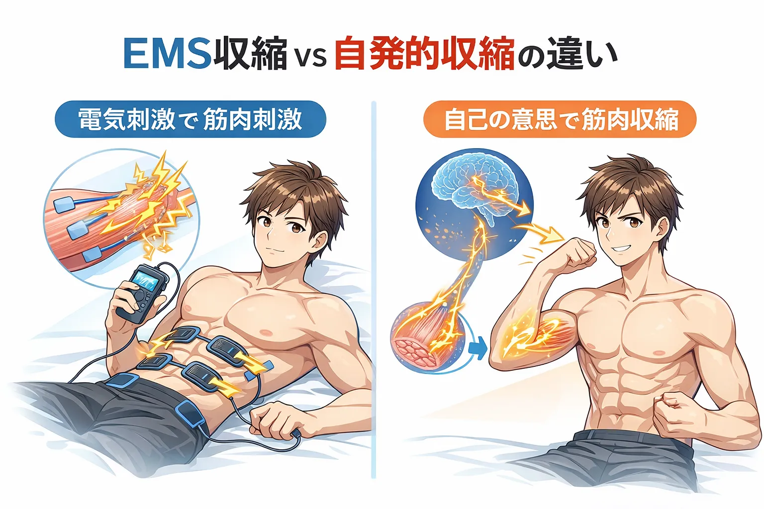 EMSによる筋収縮は受動的なものであり、自分の意思で行う随意運動とは神経の関与が大きく異なります。