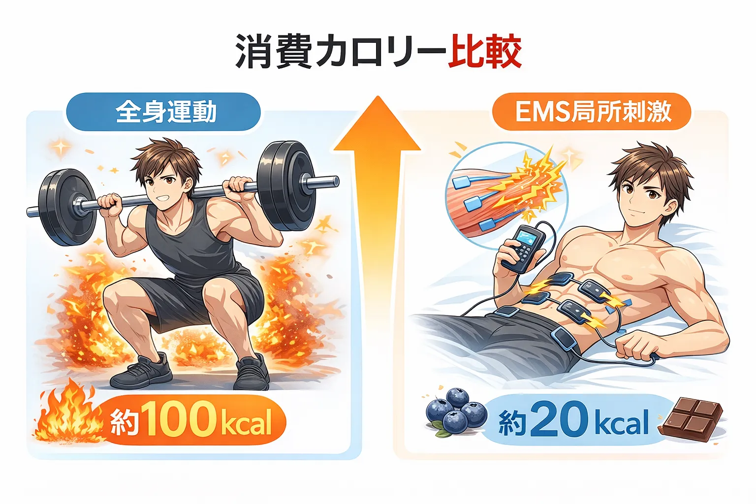 一方でEMSは、局所的な筋肉に限定された刺激であり、全身的なエネルギー消費は非常に小さいです。