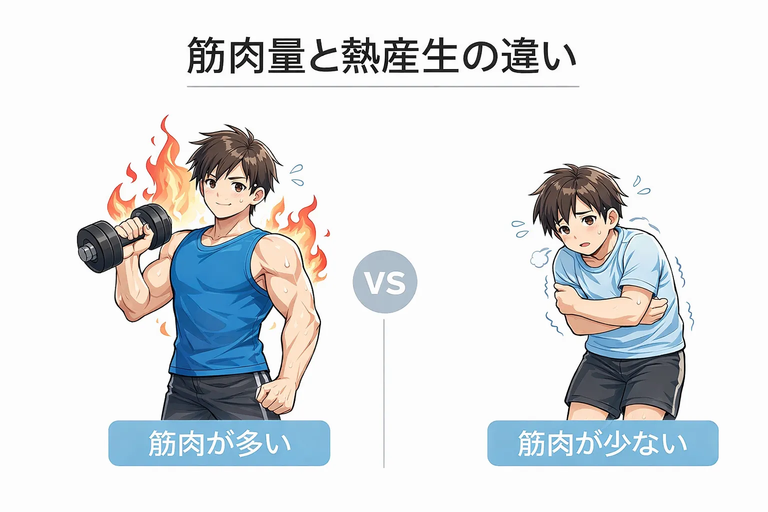逆に筋肉量が少ないと、熱産生も少なく、エネルギーが余りやすくなります。