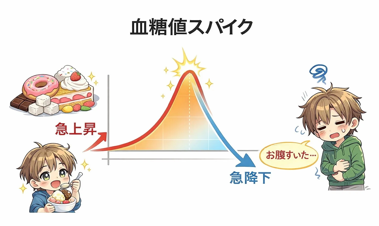 これが強い空腹感や甘いものへの欲求につながります。