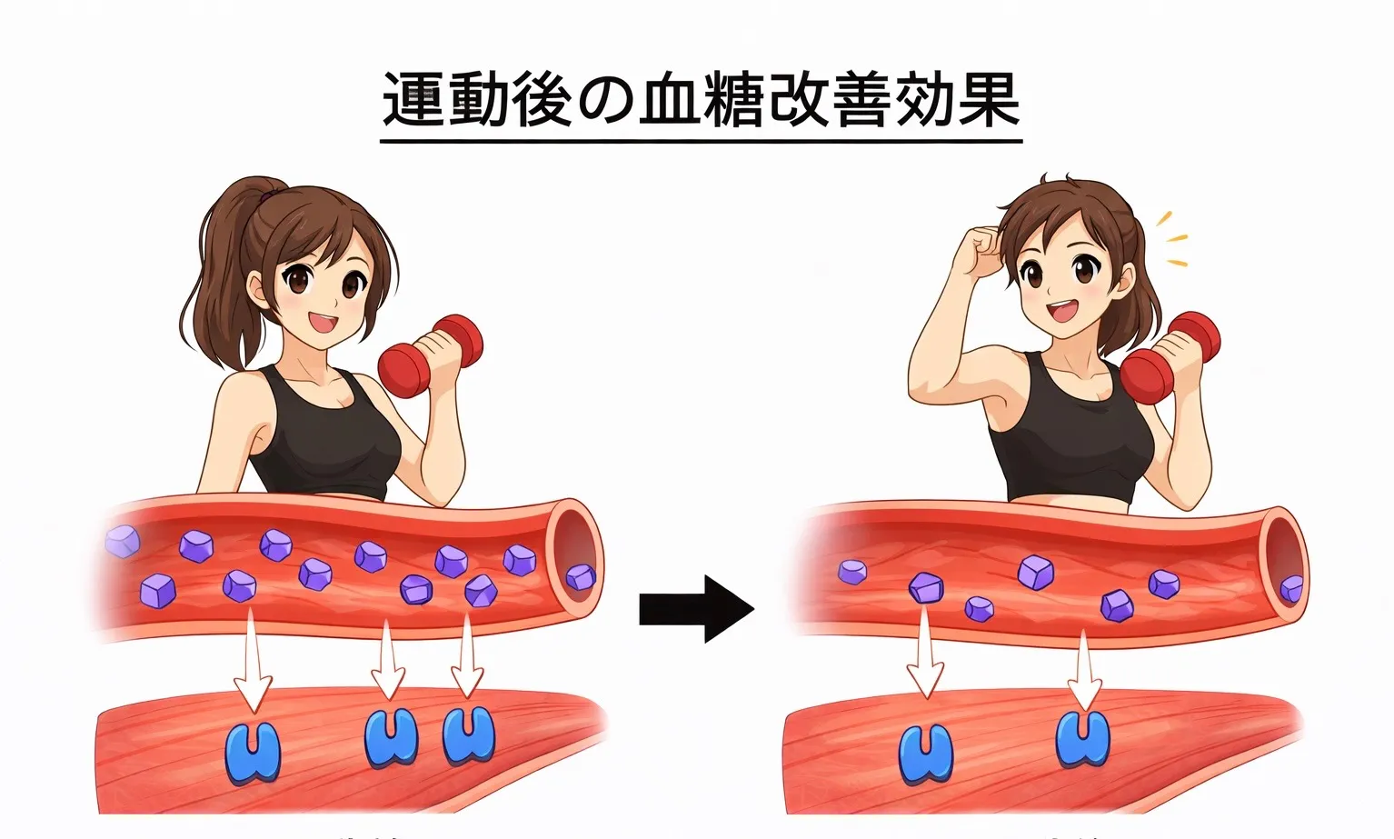 有酸素運動は血糖を即時的に下げる効果があり、筋トレは長期的に代謝を改善します。