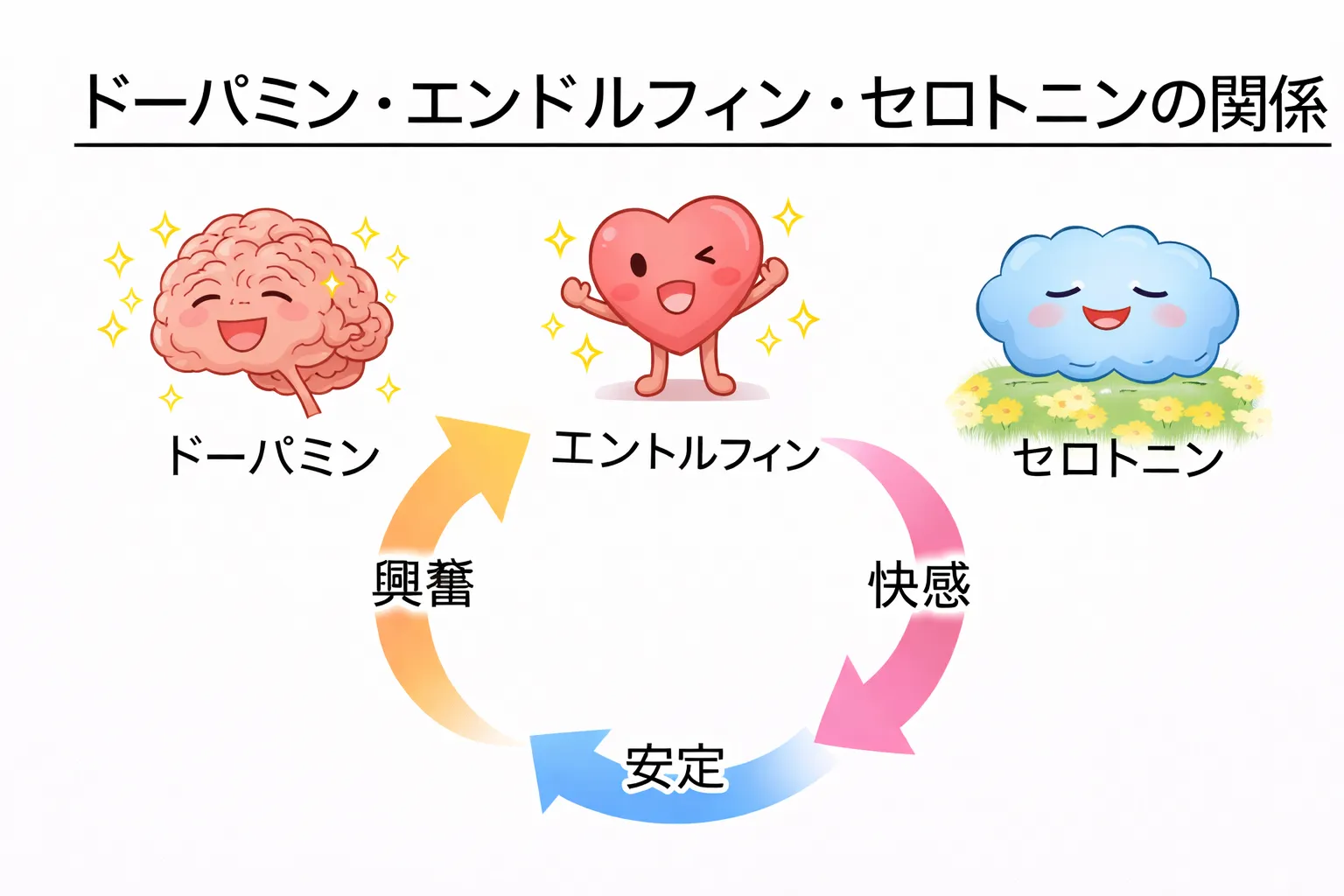 ドーパミンによる報酬、エンドルフィンによる快感、セロトニンによる安定、自己効力感の向上、神経系の活性化。