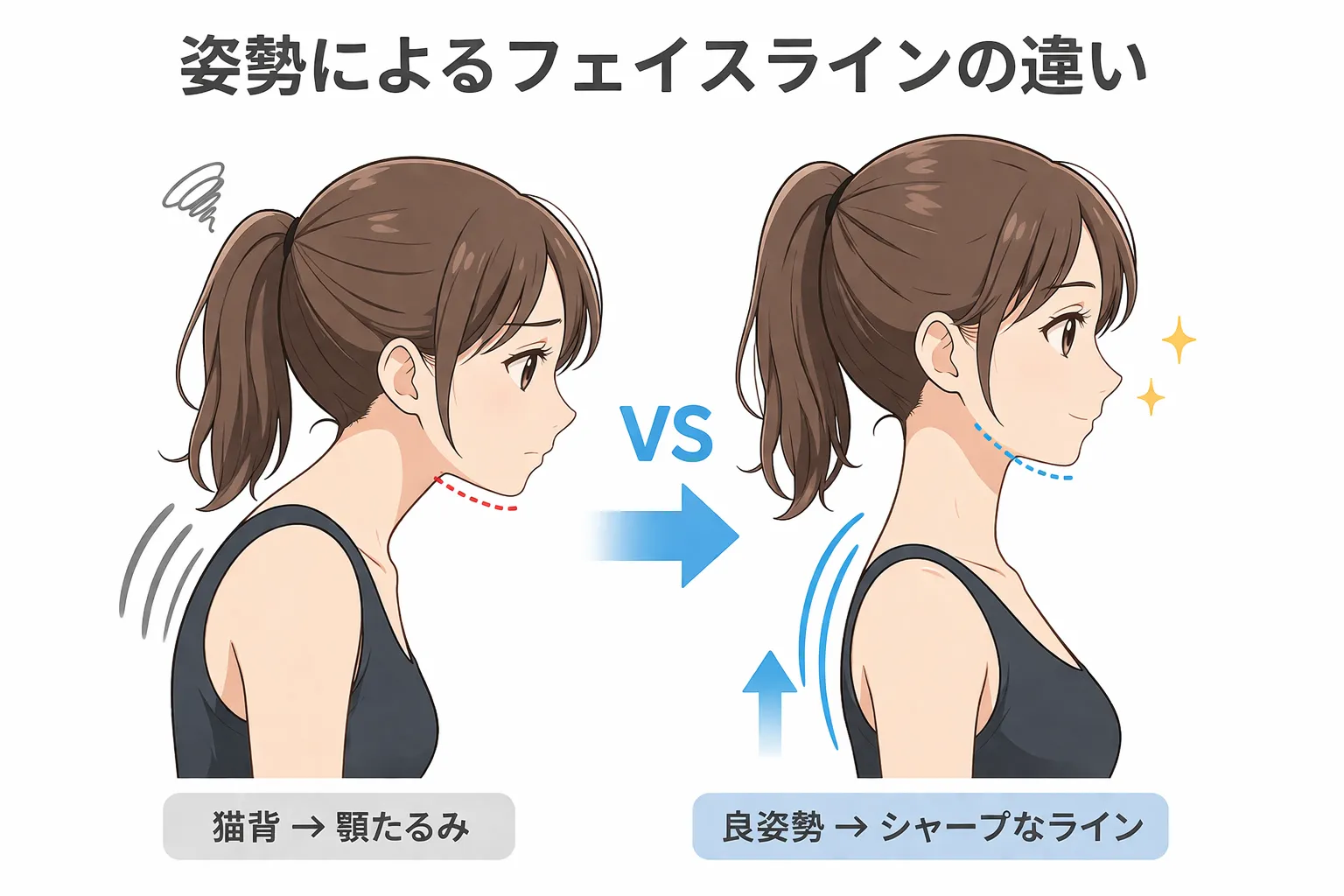 猫背やストレートネックの状態では、頭が前に出てしまい、顎下にたるみが生じやすくなります。