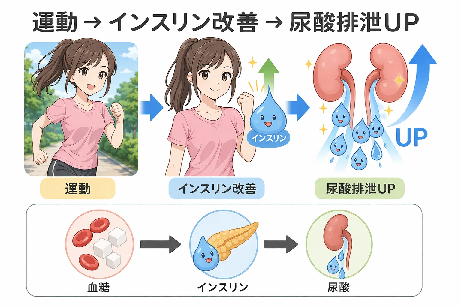 運動によって体脂肪が減少すると、この影響が軽減され、尿酸値も低下しやすくなります。