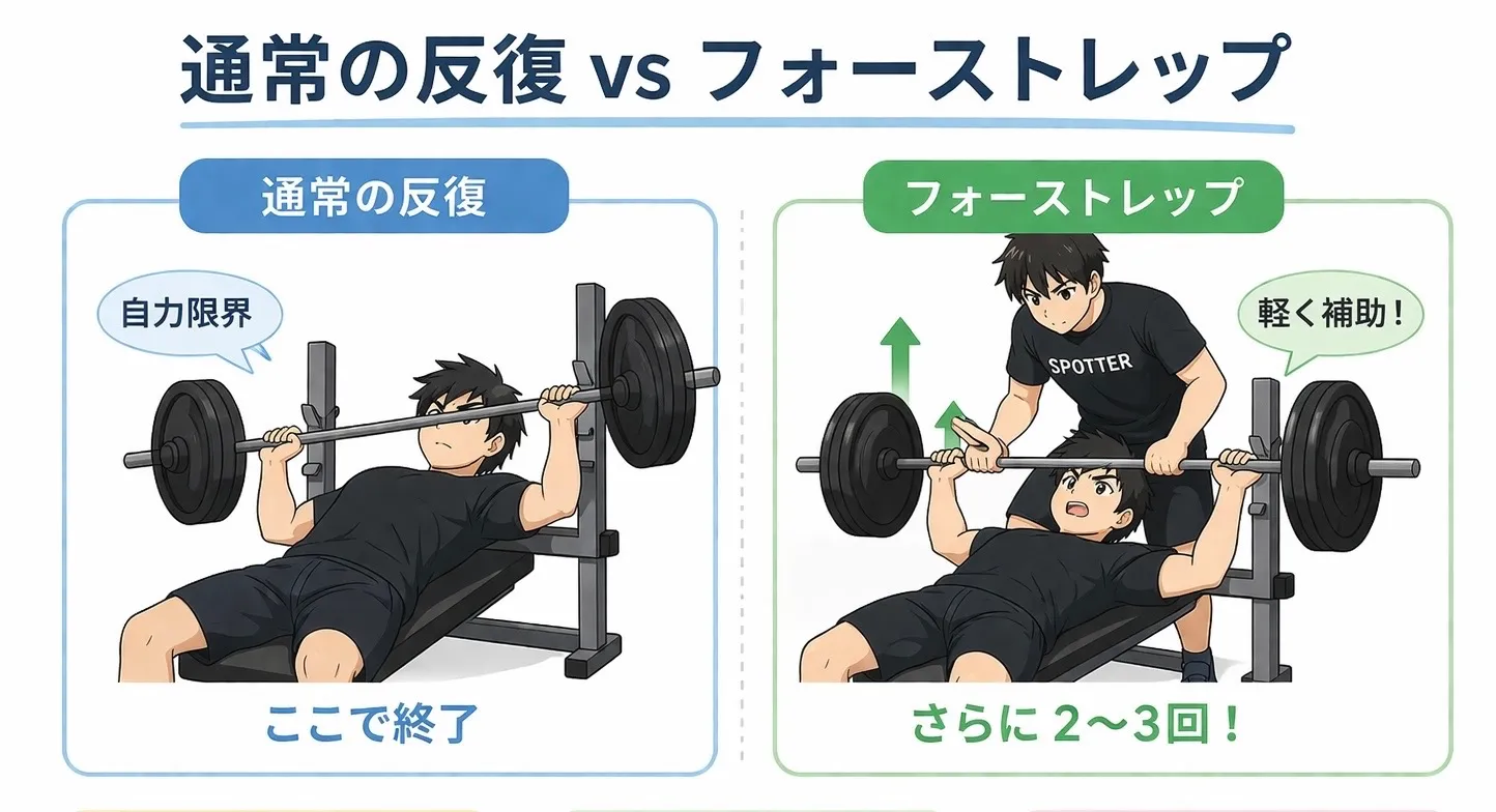 フォーストレップとは、自力では上がらない状態から、補助を受けてさらに反復を行う方法です。