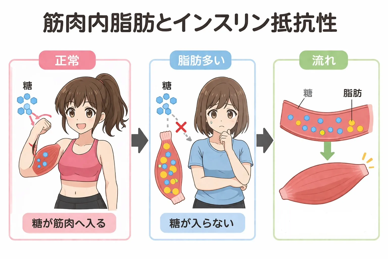 筋肉内の脂肪浸潤は、見た目やパフォーマンスだけでなく、代謝にも大きく影響します。