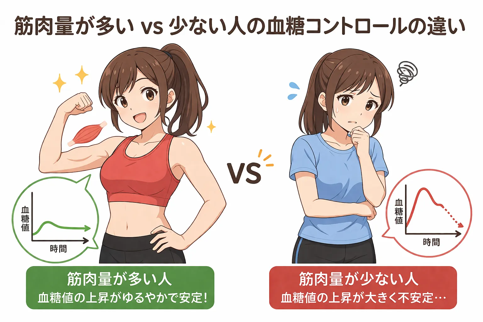 筋肉は血中の糖を取り込む最大の組織であり、筋肉量が多いほど血糖値は安定しやすくなります。