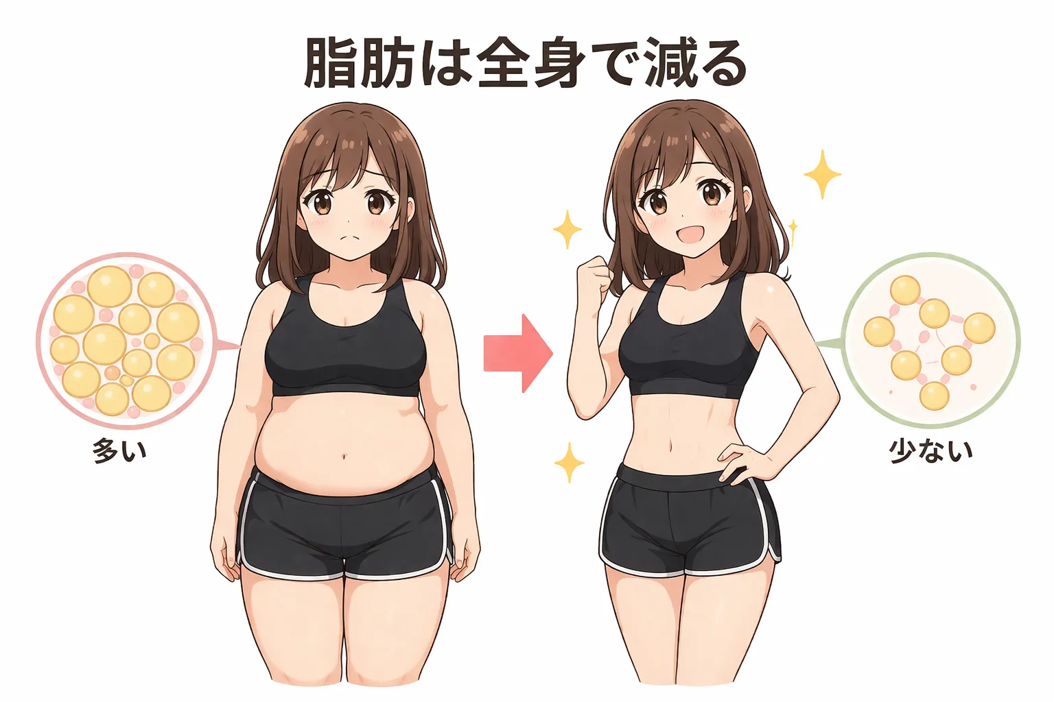 脂肪は「特定の部位だけ減る」のではなく、全身から均等に減少する傾向があります。