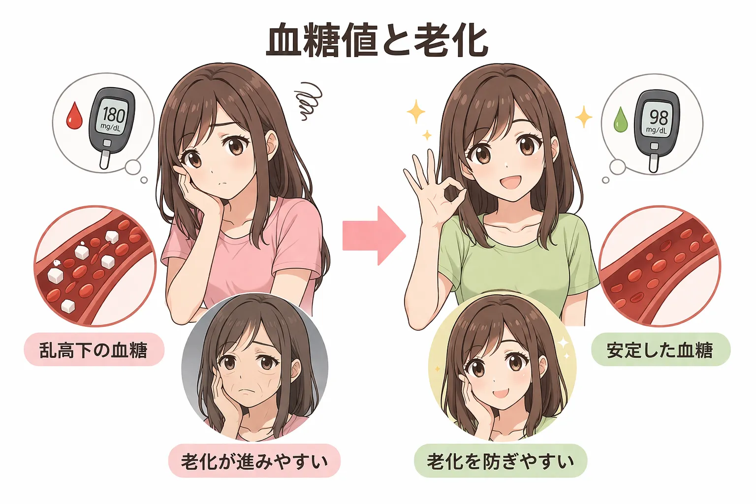 若さを保つうえで非常に重要なのが、血糖コントロールです。