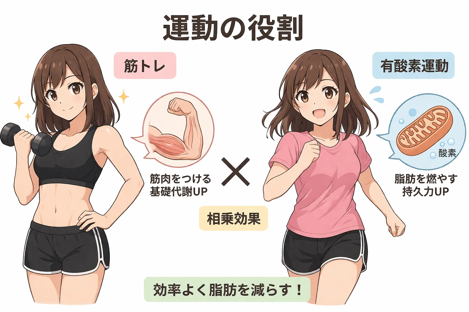 なぜなら、有酸素運動はエネルギー消費には優れていますが、筋肉量の増加には限界があるからです。