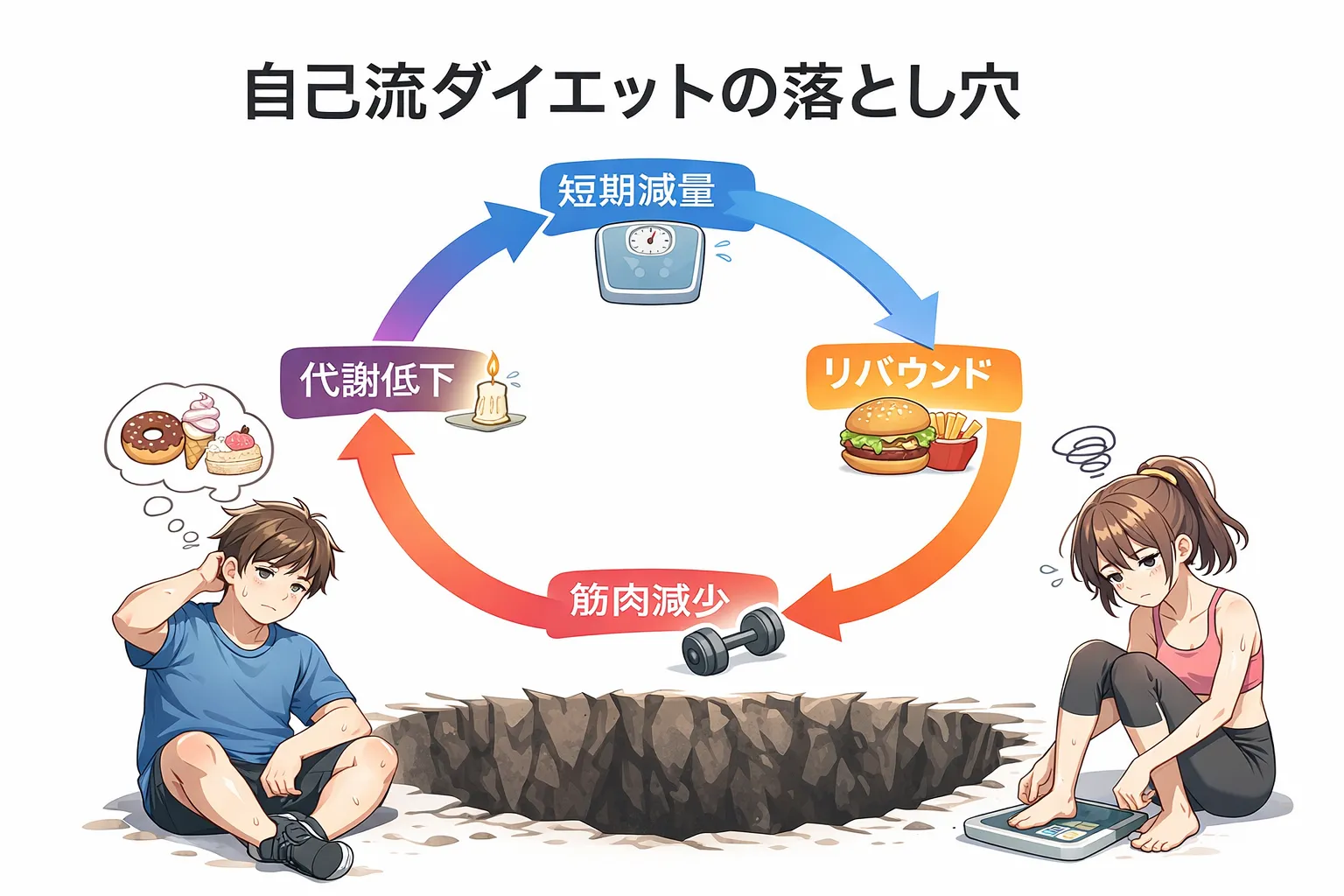 これらは一時的には体重が落ちることもありますが、筋肉量が減少し、基礎代謝が低下するため、結果的にリバウンドしやすくなります。