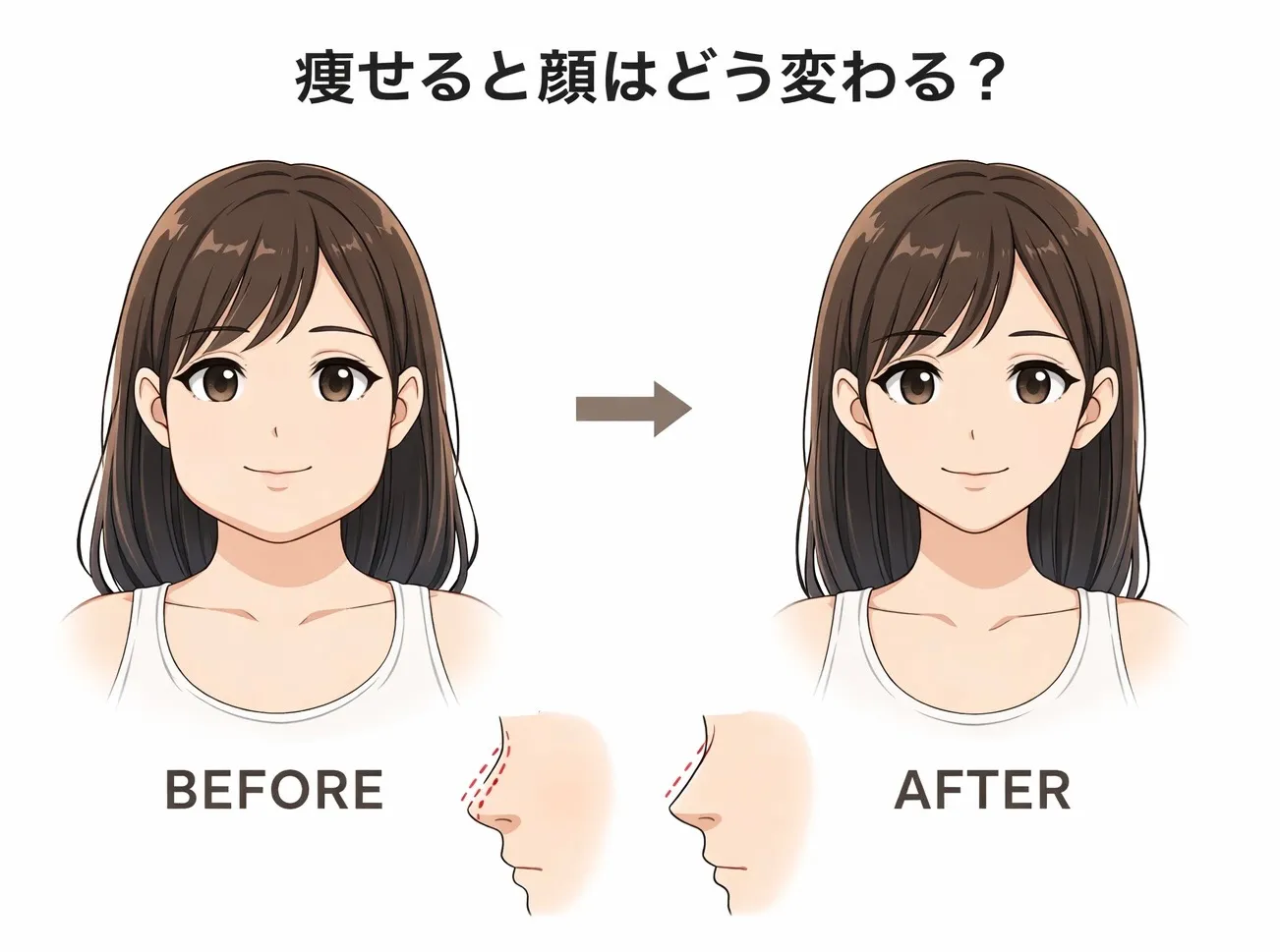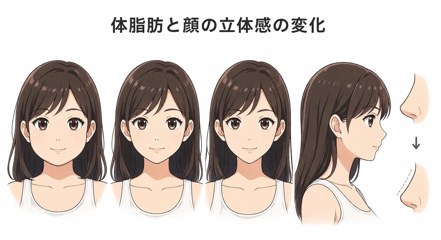 この変化は、いわゆる“顔痩せ”と呼ばれるものですが、実際には全身の脂肪減少の一部として起こっています。