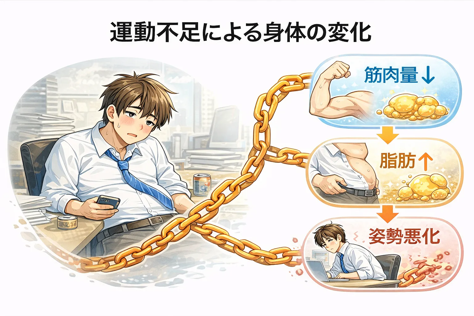 筋肉は加齢とともに自然に減少しますが、運動不足が加わることで、そのスピードは加速します。