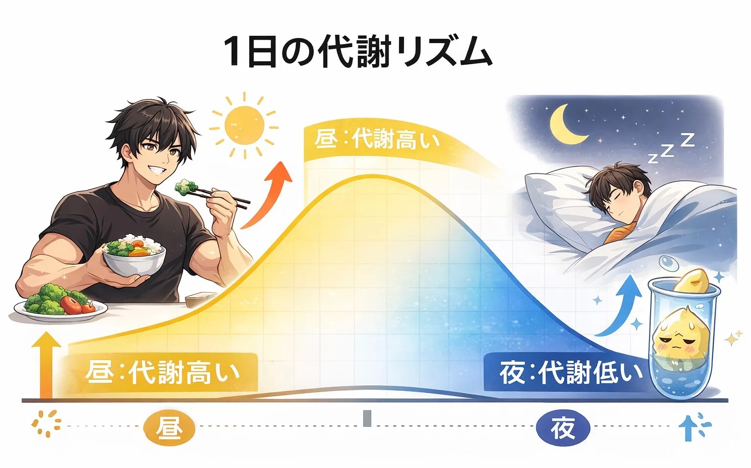 特に重要なのが、夜間はエネルギー消費が低下し、脂肪を蓄えやすい状態になることです。
