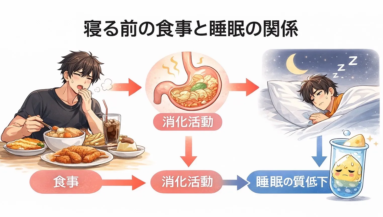 寝る直前に食事をすると、消化活動が活発になり、深い睡眠が妨げられます。