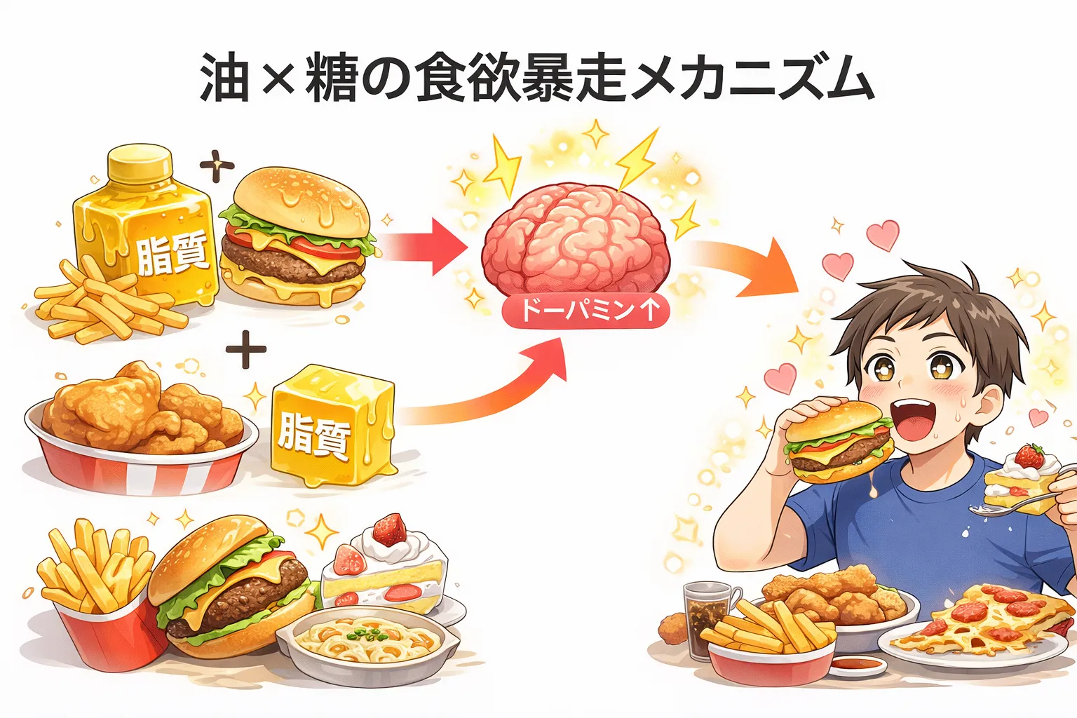 研究でも、高脂肪・高糖質の食品はドーパミン分泌を強く刺激し、依存的な摂取行動を引き起こすことが示されています。