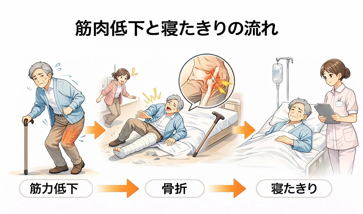 逆に脚の筋肉が弱くなると、外出が減り、活動量が低下し、さらに筋肉が減るという悪循環に入ります。