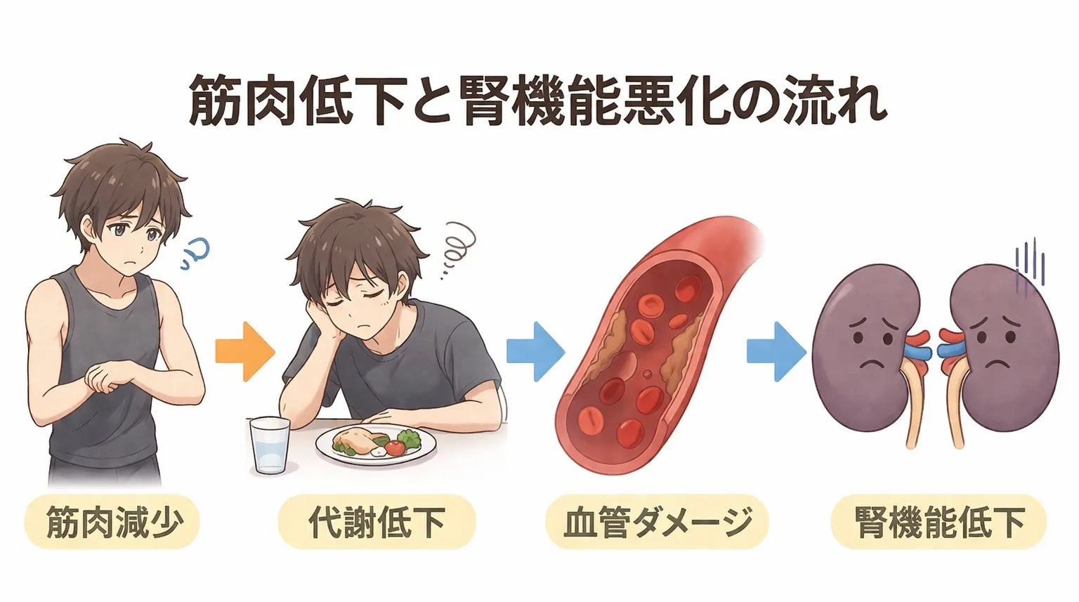 つまり筋肉が減ることで、間接的に腎臓にダメージが蓄積されるのです。