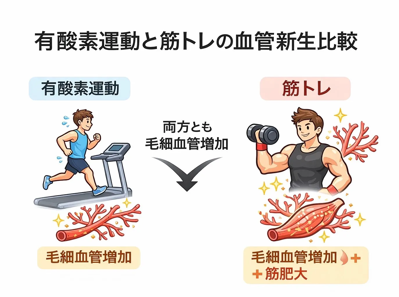 しかし、近年の研究では、レジスタンストレーニング(筋トレ)でも同様に血管新生が起こることが示されています。