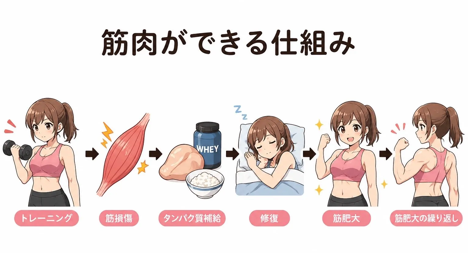トレーニングによって壊れた筋繊維は、タンパク質を材料にして修復されます。