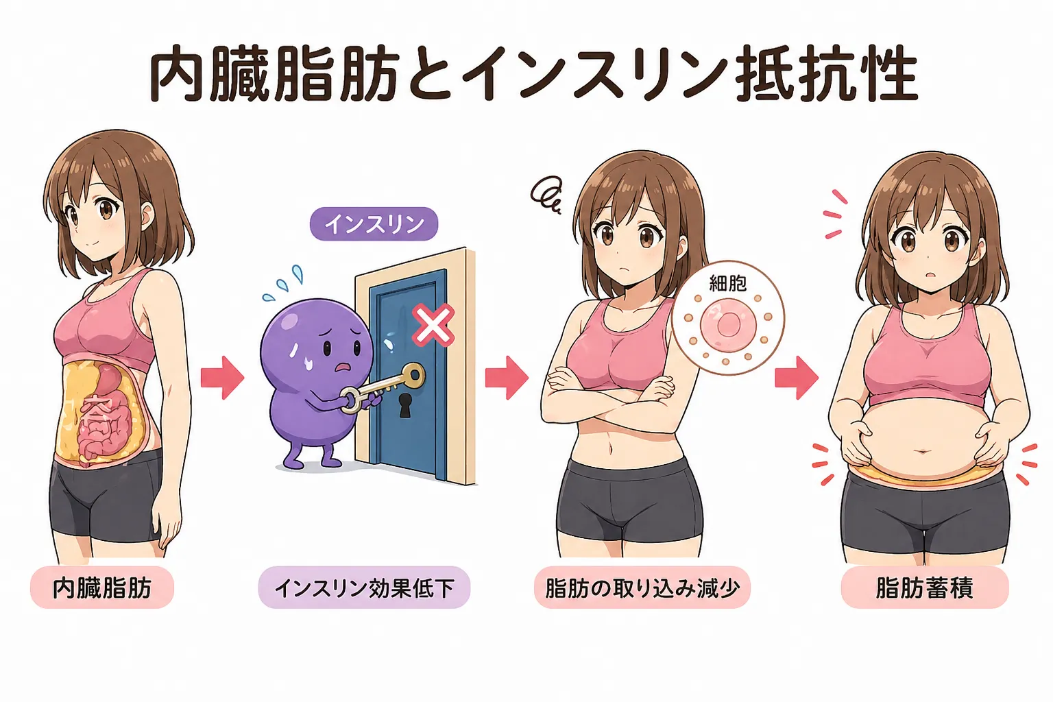 内臓脂肪が増えると、インスリンの効きが悪くなります。