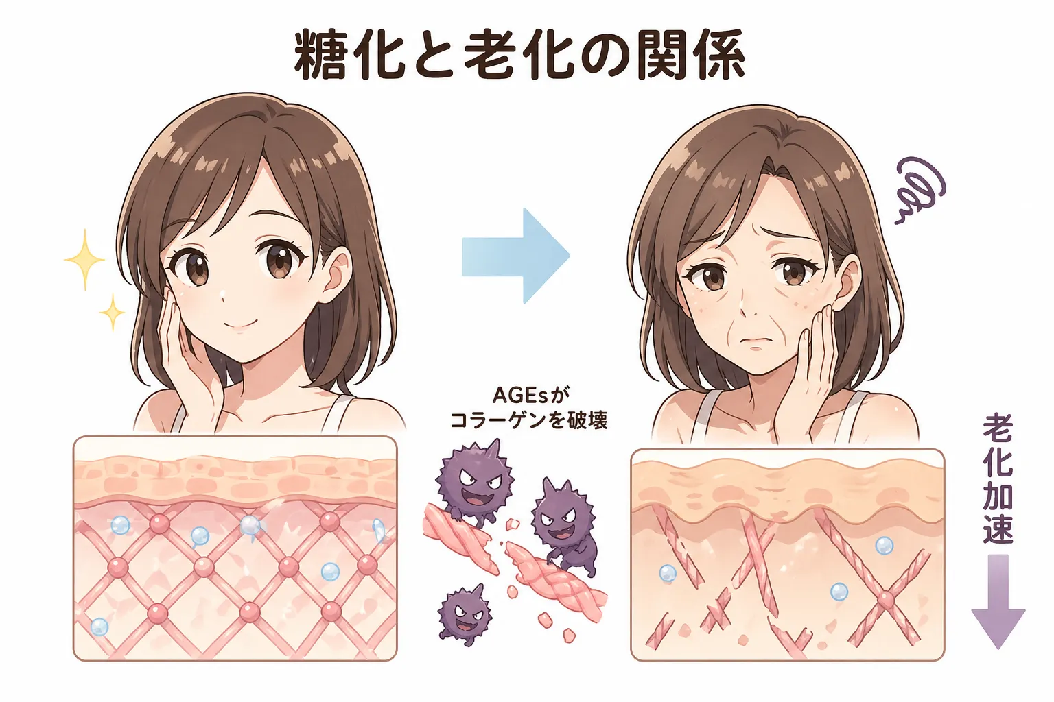 これは、体内のタンパク質と糖が結びつき、「AGEs(終末糖化産物)」という物質を生成する反応です。