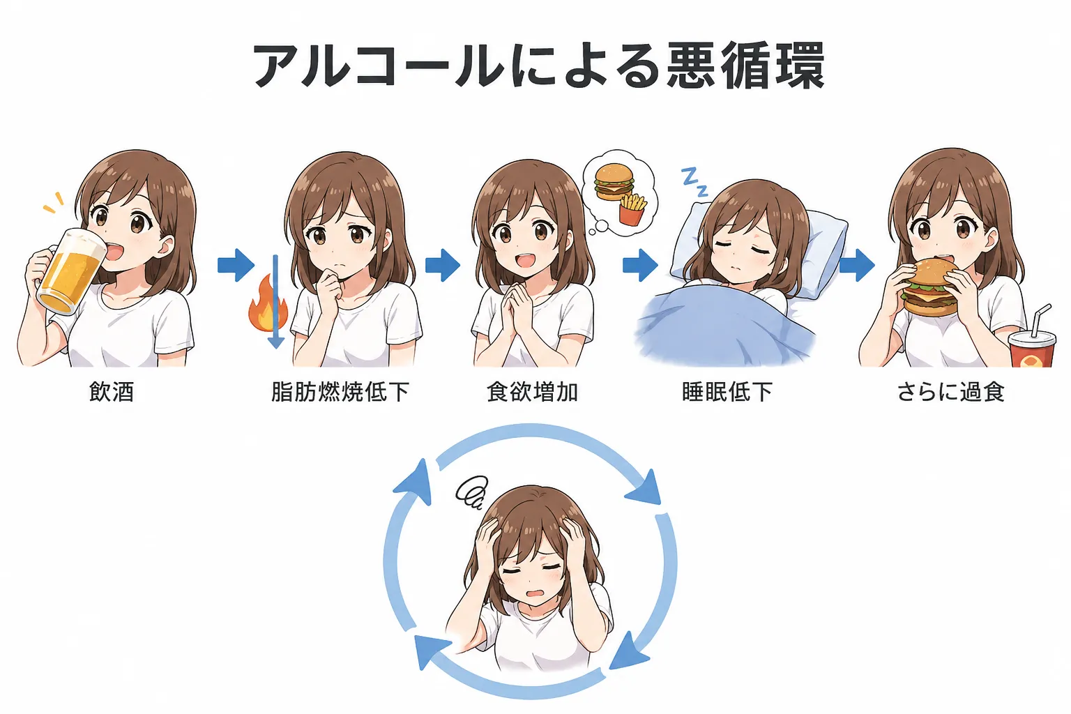 つまり、「アルコールを飲む=脂肪が燃えにくくなる」という状態を作り出します。