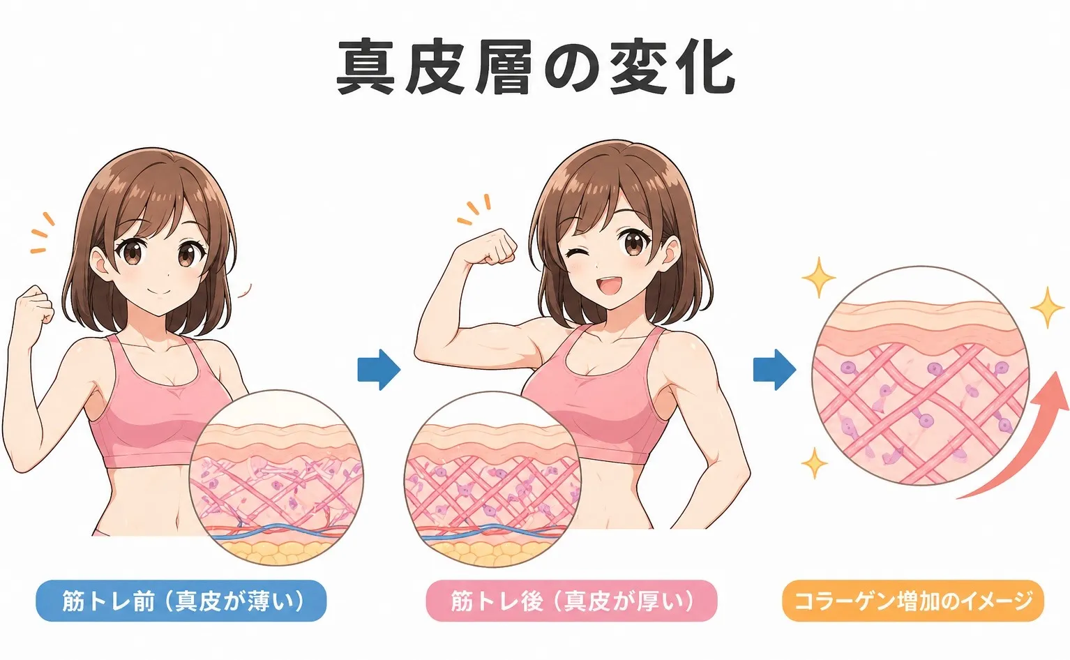 ある研究では、中高年女性を対象にレジスタンストレーニング(筋トレ)と有酸素運動を比較したところ、筋トレ群では真皮の厚さが増加したことが報告されています。