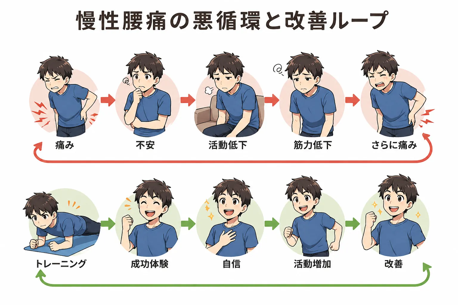 これにより、痛みに対する恐怖が軽減され、活動量が増加し、さらに改善が進むという好循環が生まれます。