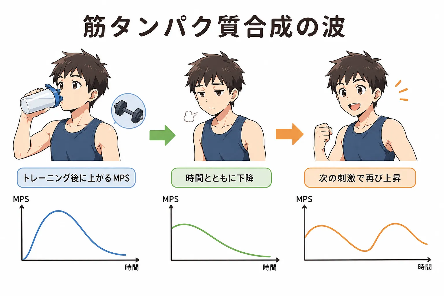 筋トレ後、筋タンパク質合成は一時的に上昇します。