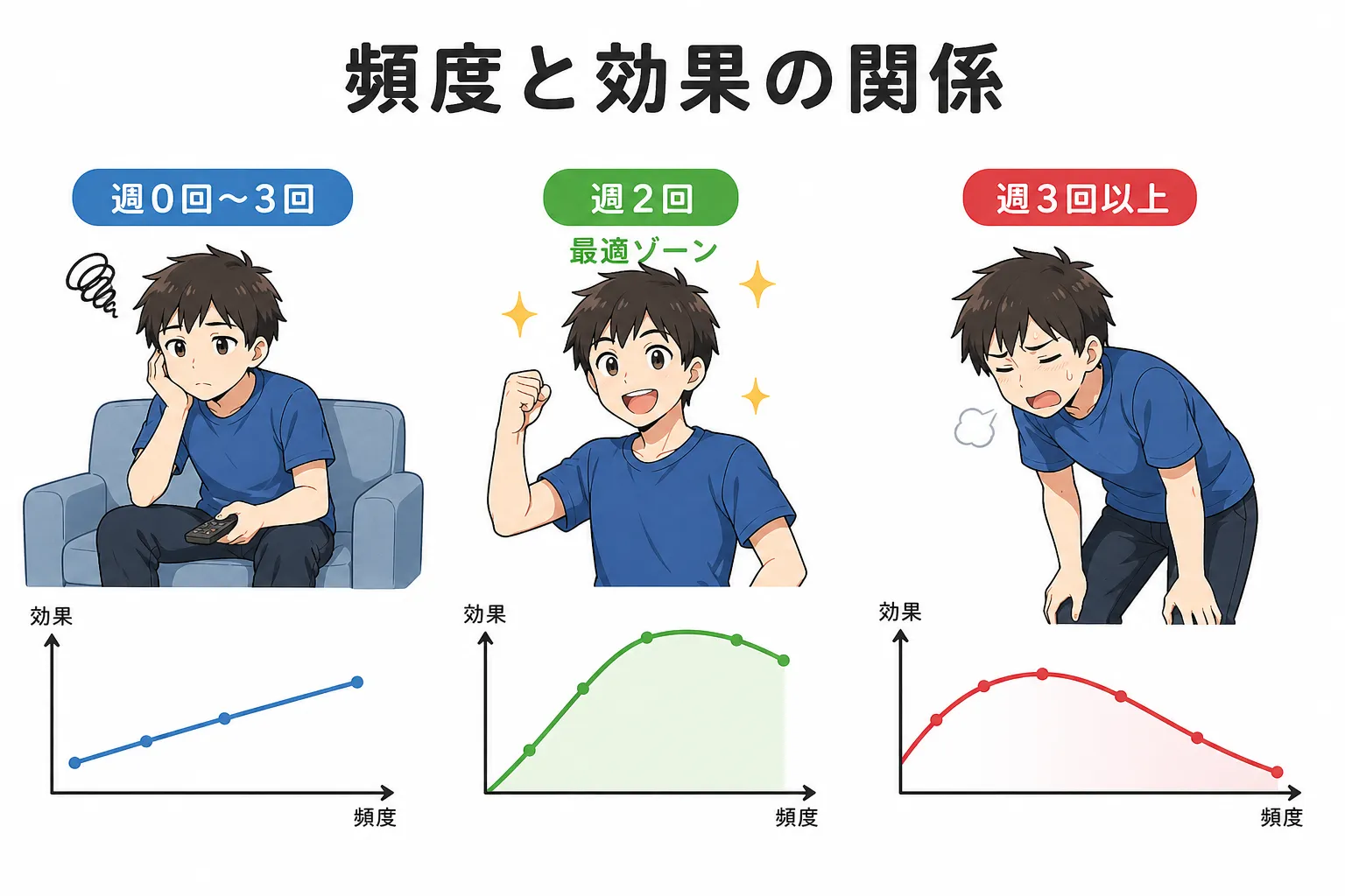 もちろん個人差はありますが、「週1回以下」になると、維持はできても成長効率はかなり落ちます。