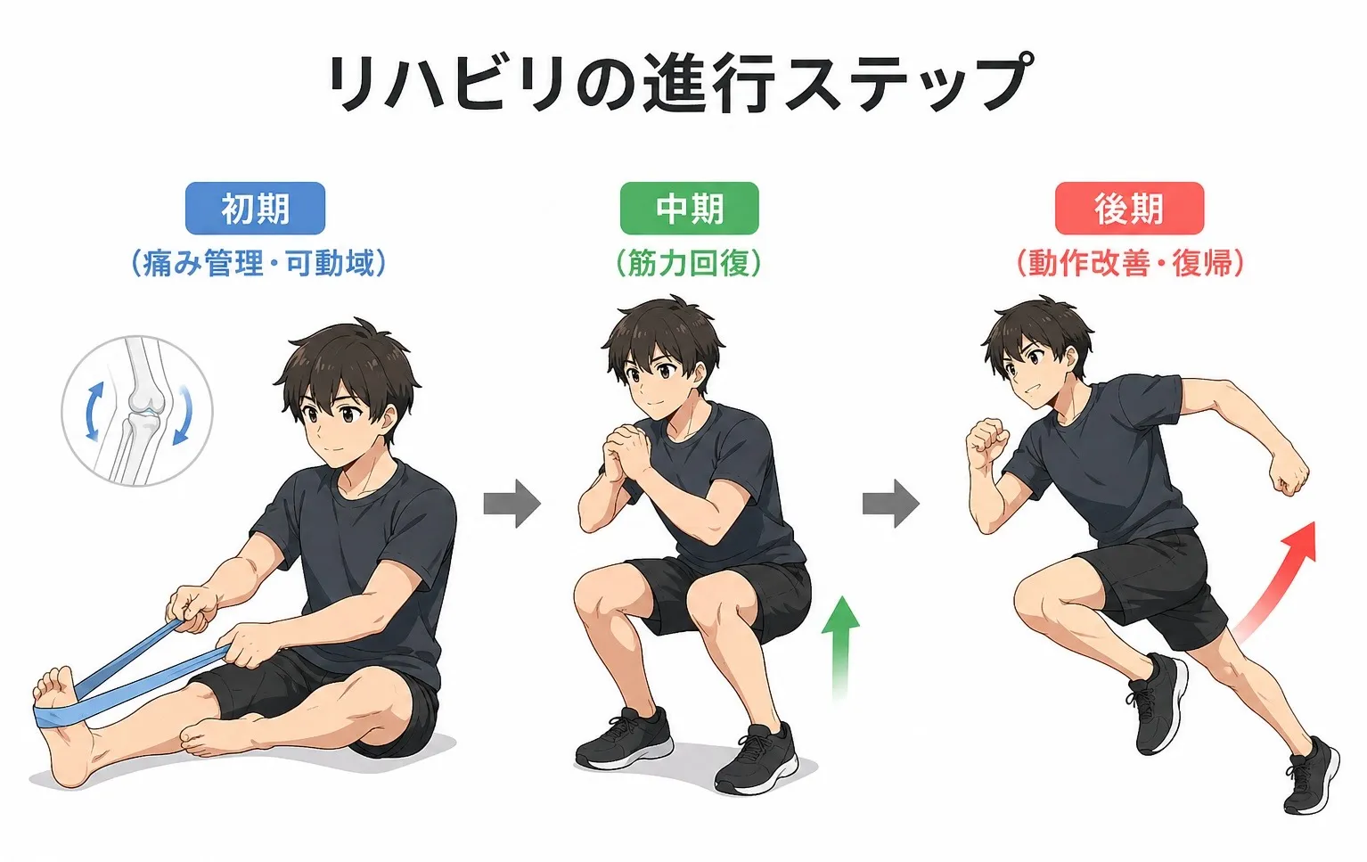いきなり高強度のトレーニングを行うのではなく、痛みの出ない範囲で徐々に負荷を上げていくことが重要です。