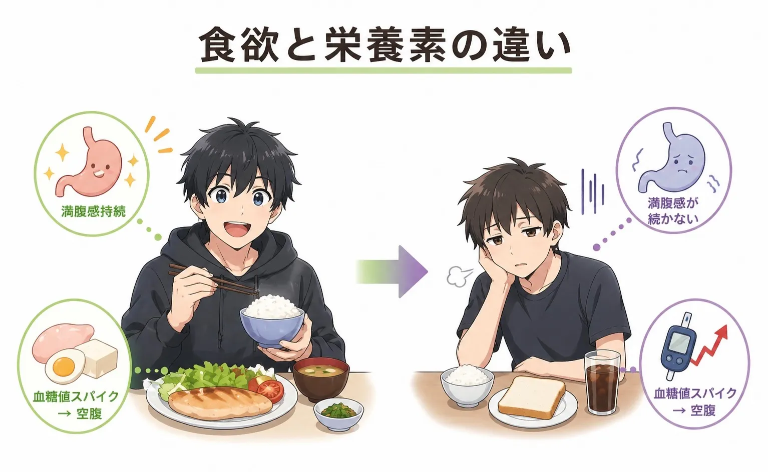 一方で、炭水化物中心の食事は血糖値の変動が大きく、空腹感を引き起こしやすいです。