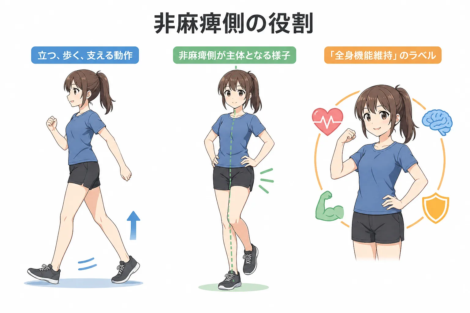 非麻痺側の筋力を維持・向上させることで、立ち上がり、歩行、移動などの基本動作が安定します。