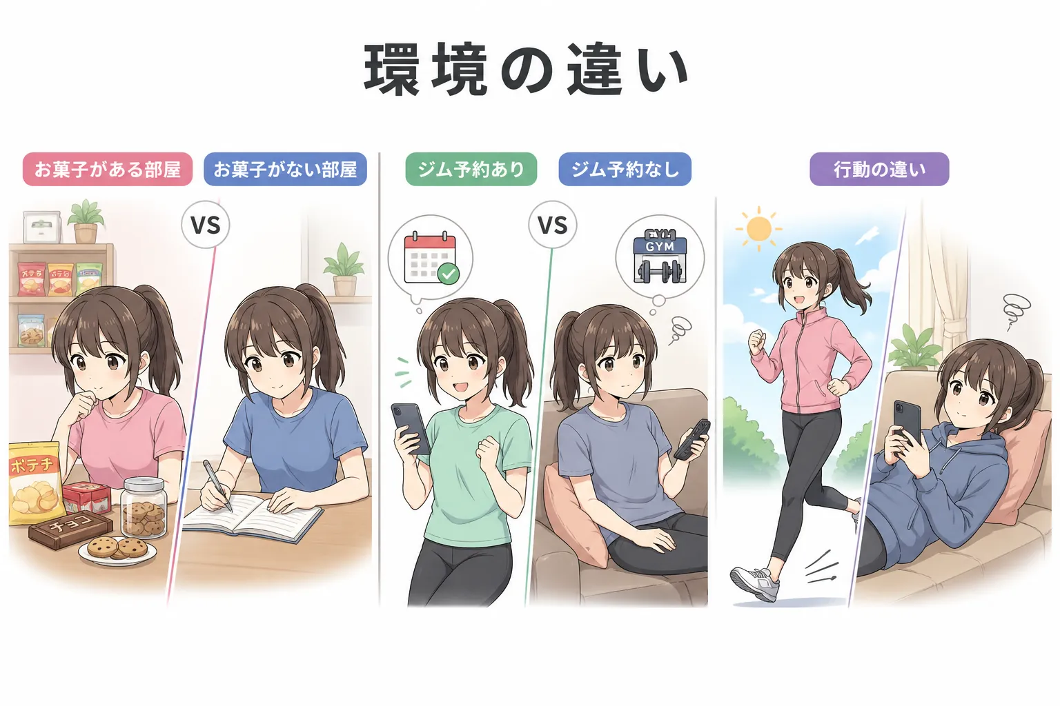 例えば、家にお菓子があれば食べてしまうし、ジムの予約があれば行く確率が上がります。