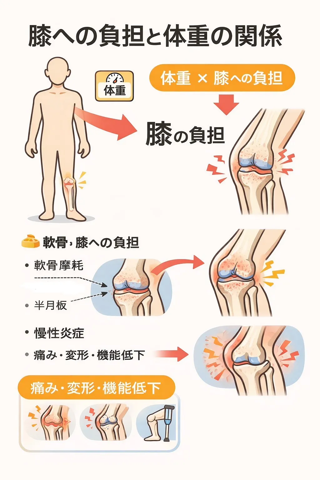 体重と変形性膝関節症(膝OA)の関係 ―重い体重が膝を壊すメカニズムと予防法―監修・著者:パーソナルジム心斎橋理学療法士志戸岡大起https://personalgymshinsaibashi.jp/前回記事:慢性腎臓病(CKD)に対する運動療法の効果「最近膝が痛い……